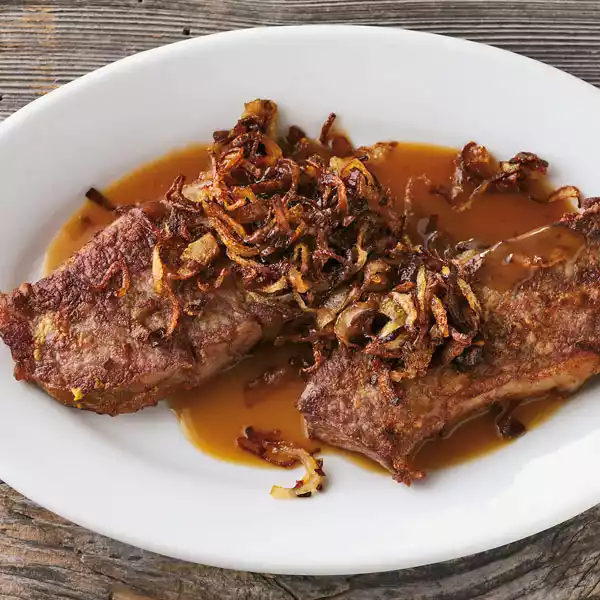 Finally, thicken the gravy with small pieces of cold butter. Don't let it boil. Then add the meat, along with any accumulated juices, to the gravy and heat through briefly. Scatter the fried onions over the top before serving.